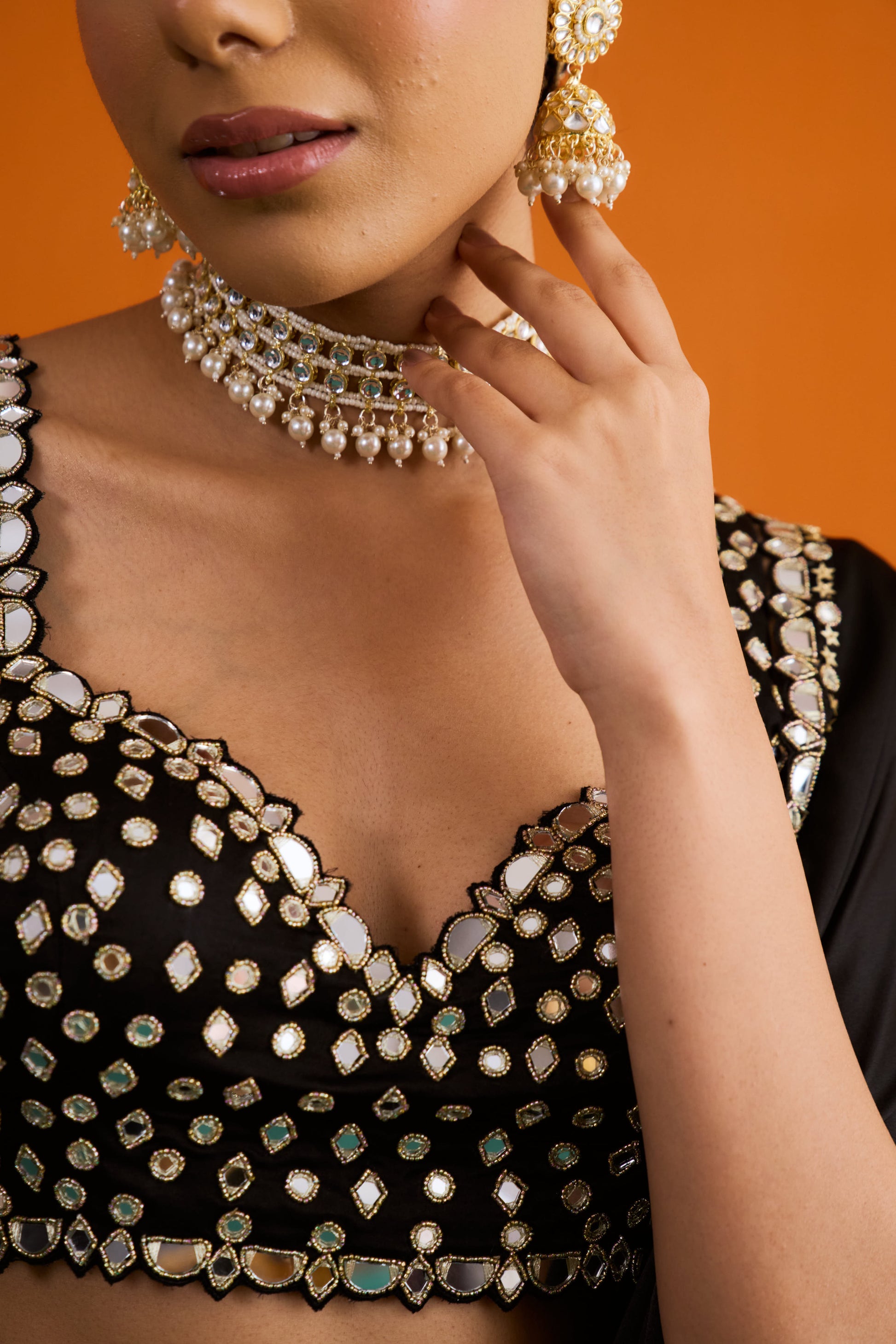 The sleeveless blouse, featuring a deep sweetheart neckline, is fully hand-embroidered with mirrors, beads, and cutdana - a dazzling interplay of texture and light. The deep U-cut back is finished with a delicate dori tie and statement mirror tassels, adding an element of graceful sensuality.