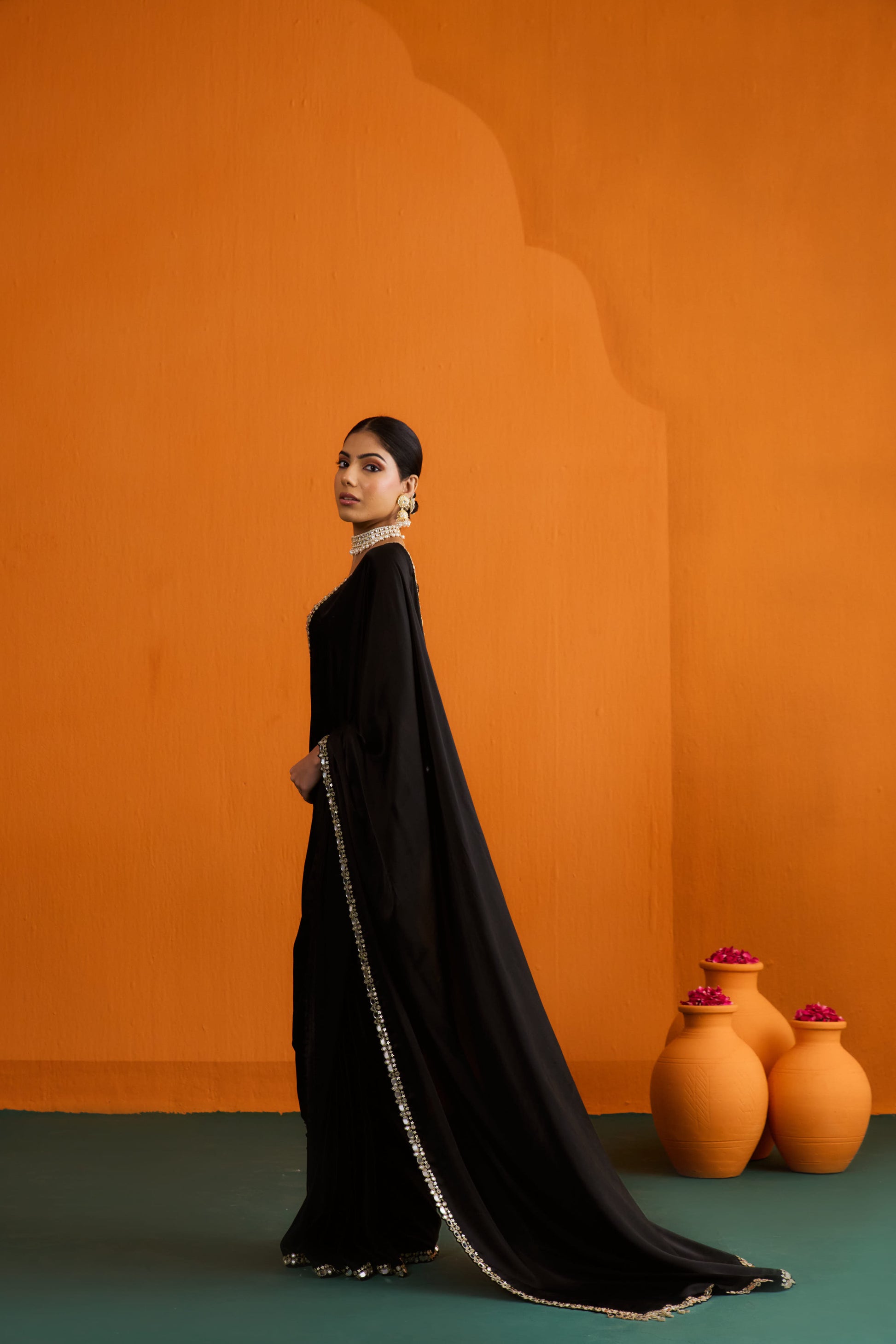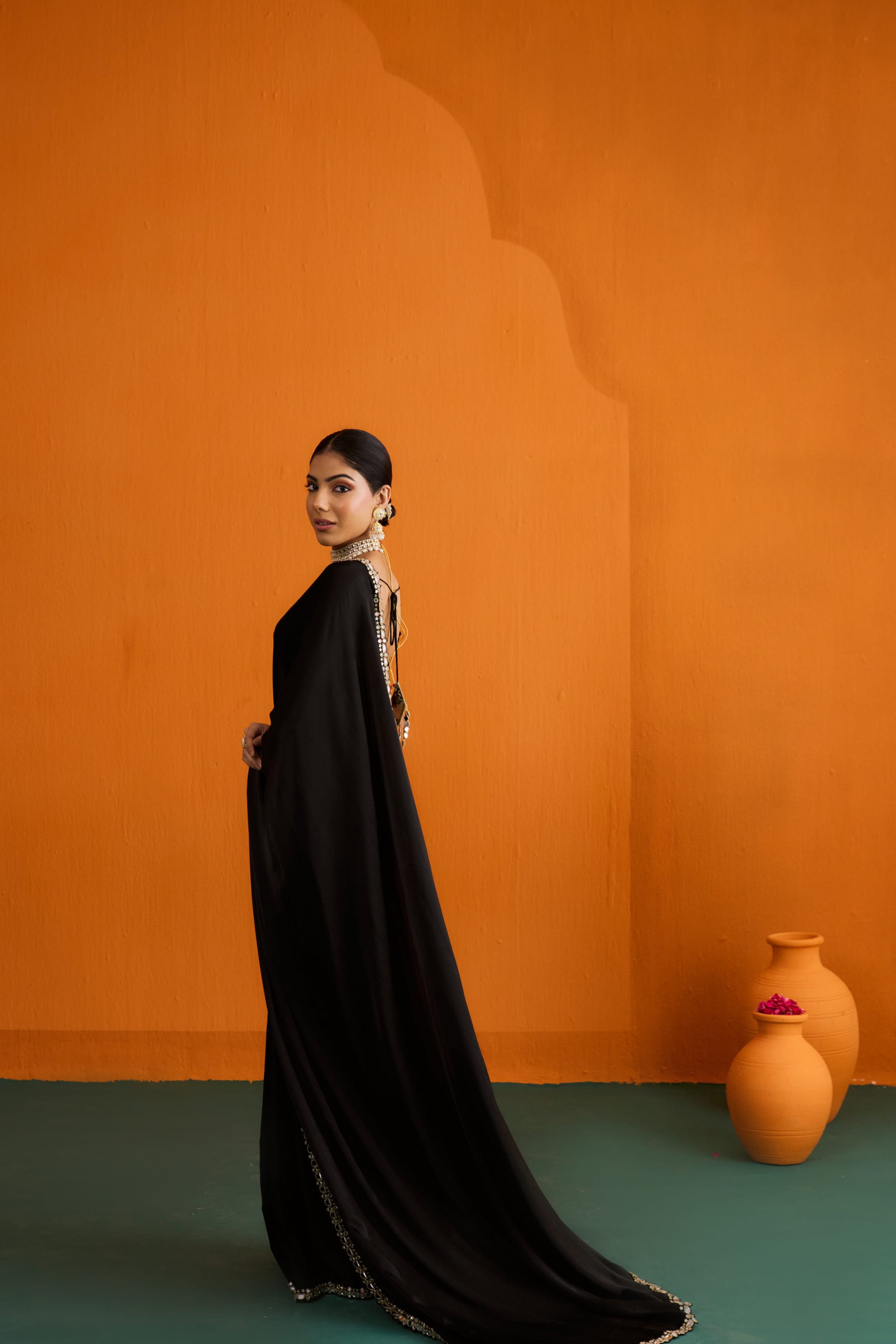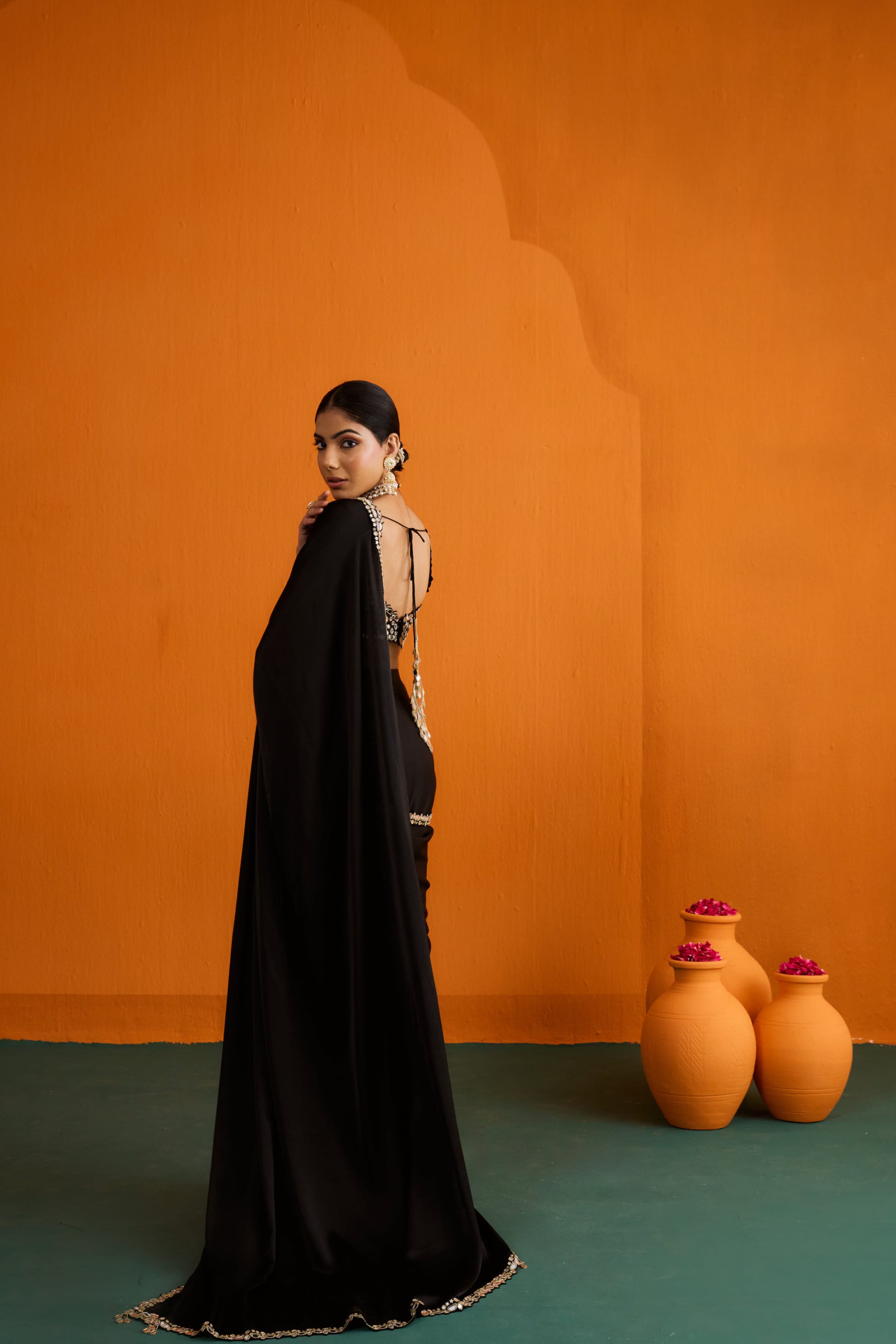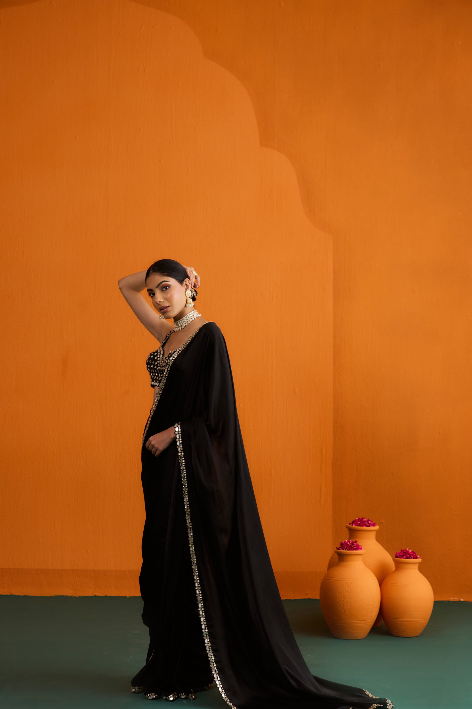 Elegant yet striking, the Chandni Saree is designed for the modern woman who embraces tradition with a contemporary edge - perfect for cocktail evenings, festive celebrations, or a modern reception look that speaks in quiet sophistication and radiant confidence.