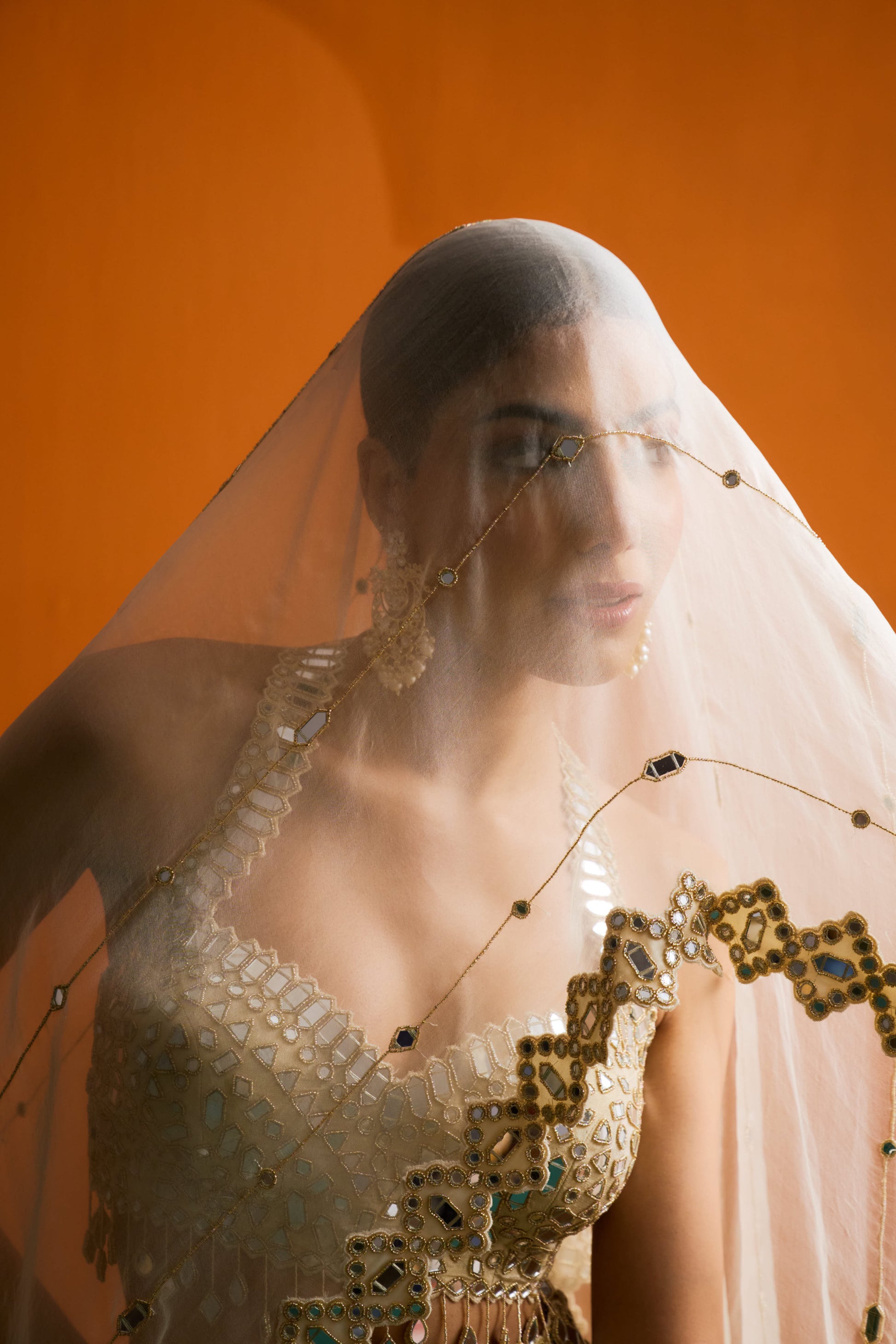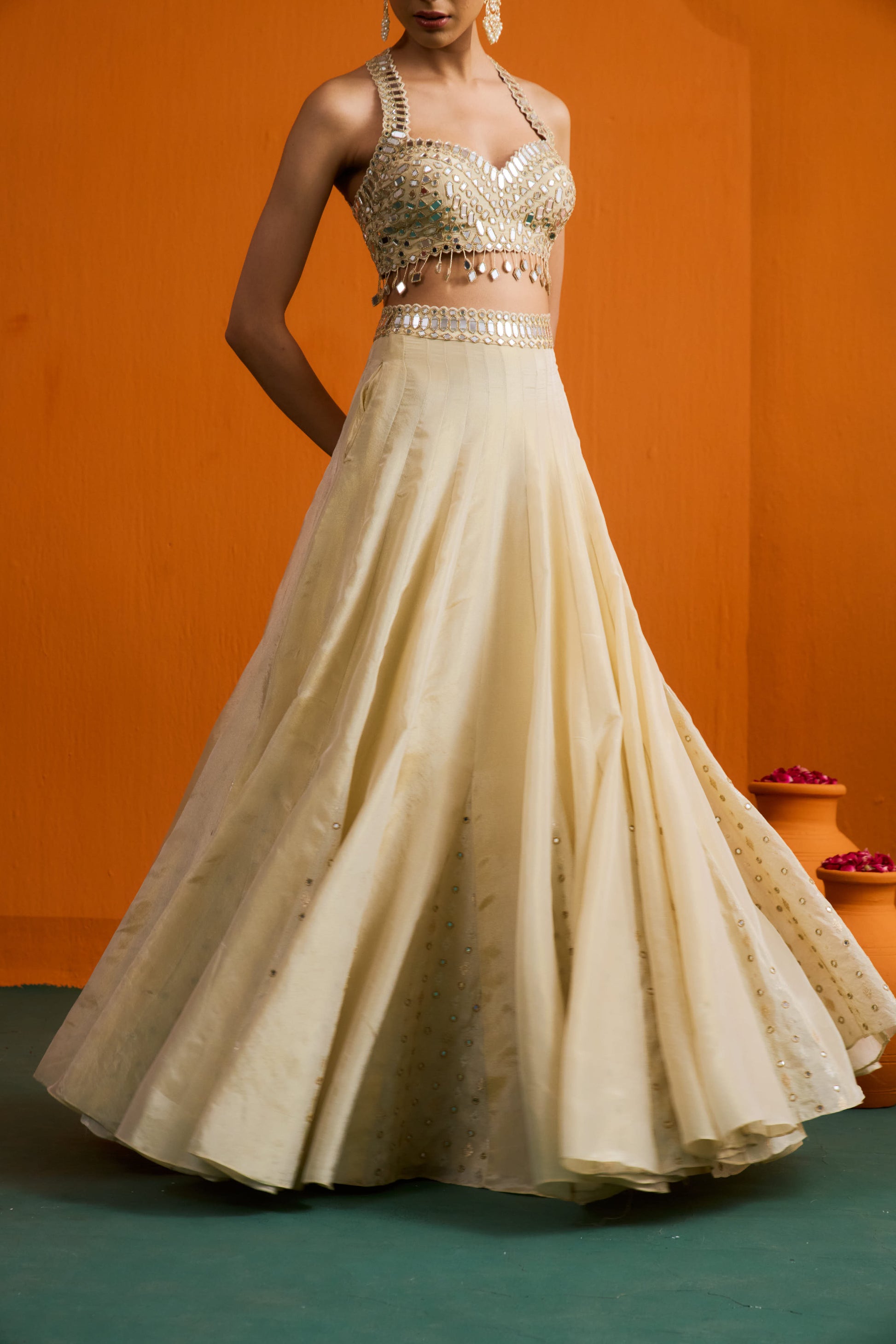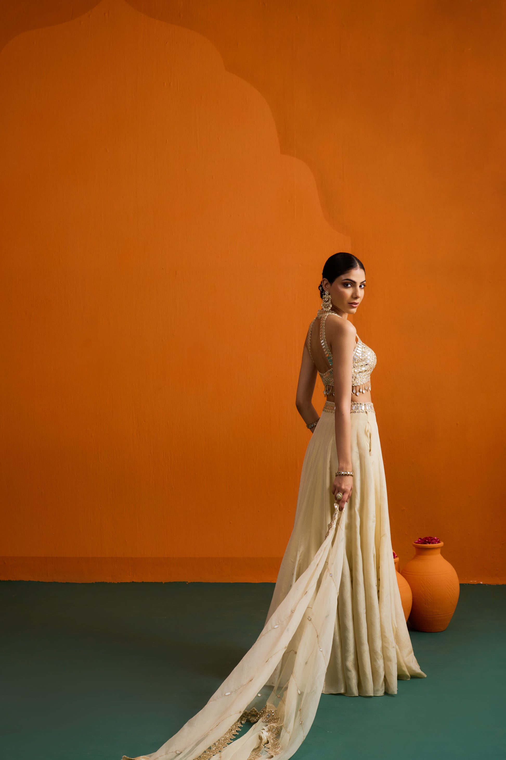 Ethereal and radiant, the Tara Lehenga captures the festive spirit through its intricate mirrorwork and luminous craftsmanship. The lehenga, crafted in flowing silk tissue, features embroidered kalis adorned with mirrorwork, while the scalloped belt of the kurta is delicately hand-embroidered with mirrors, accentuating the waist with graceful detail.
