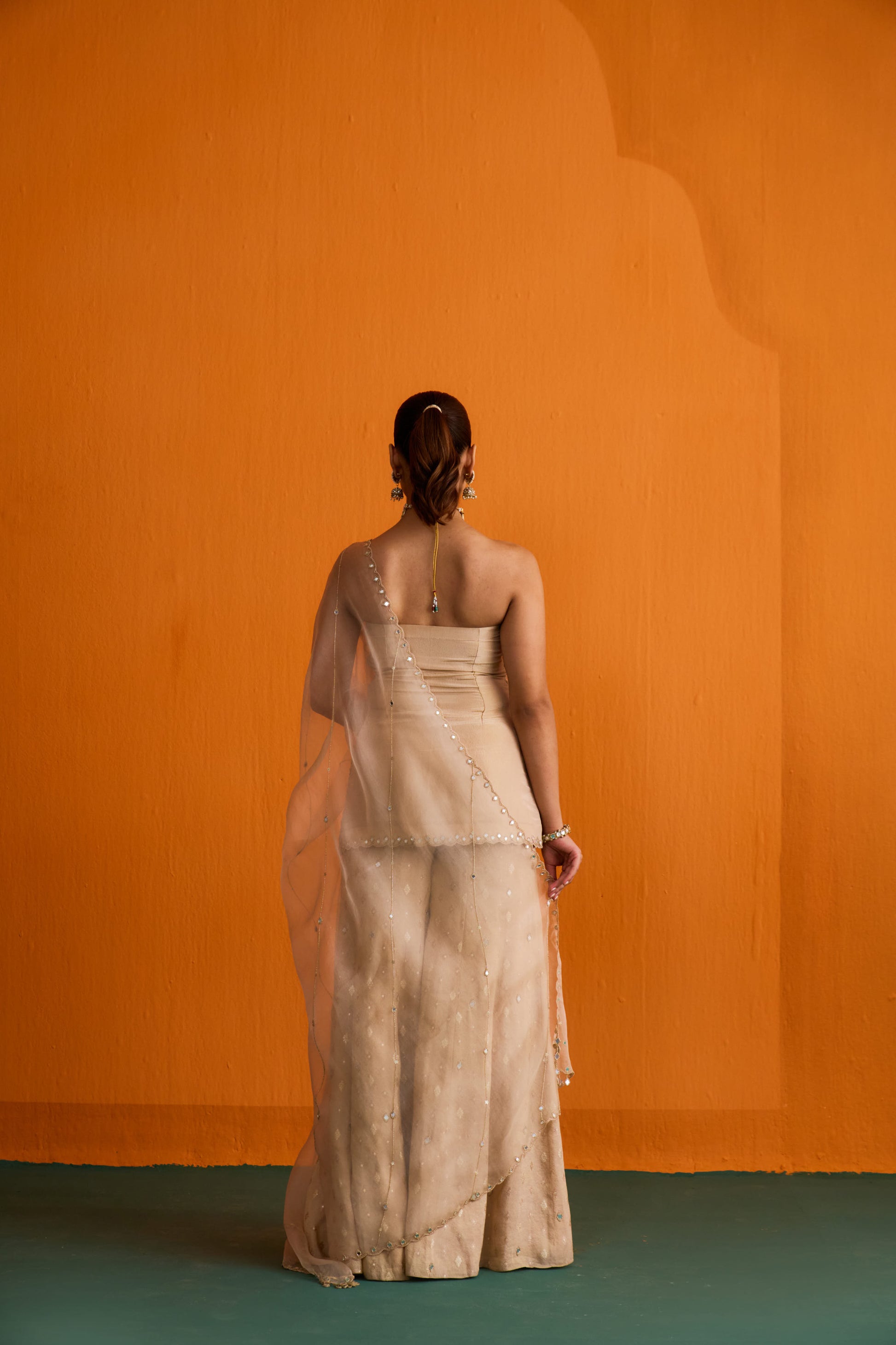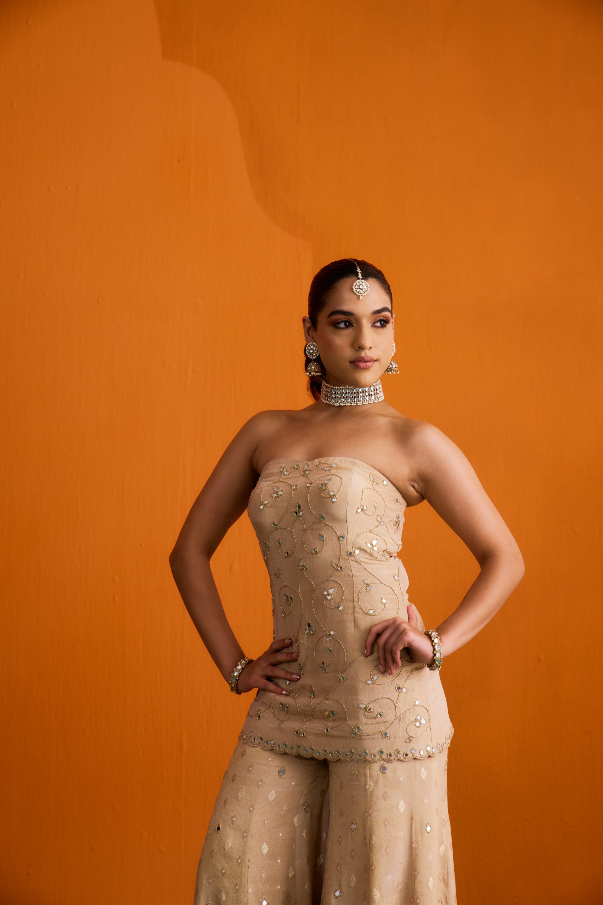 Exuding understated luxury, the Tisya Sharara Set in champagne beige is a perfect blend of modern elegance and traditional craftsmanship. The sharara, crafted in silk tissue, is adorned with delicate mirror booti embroidery scattered throughout, creating a subtle shimmer with every movement.