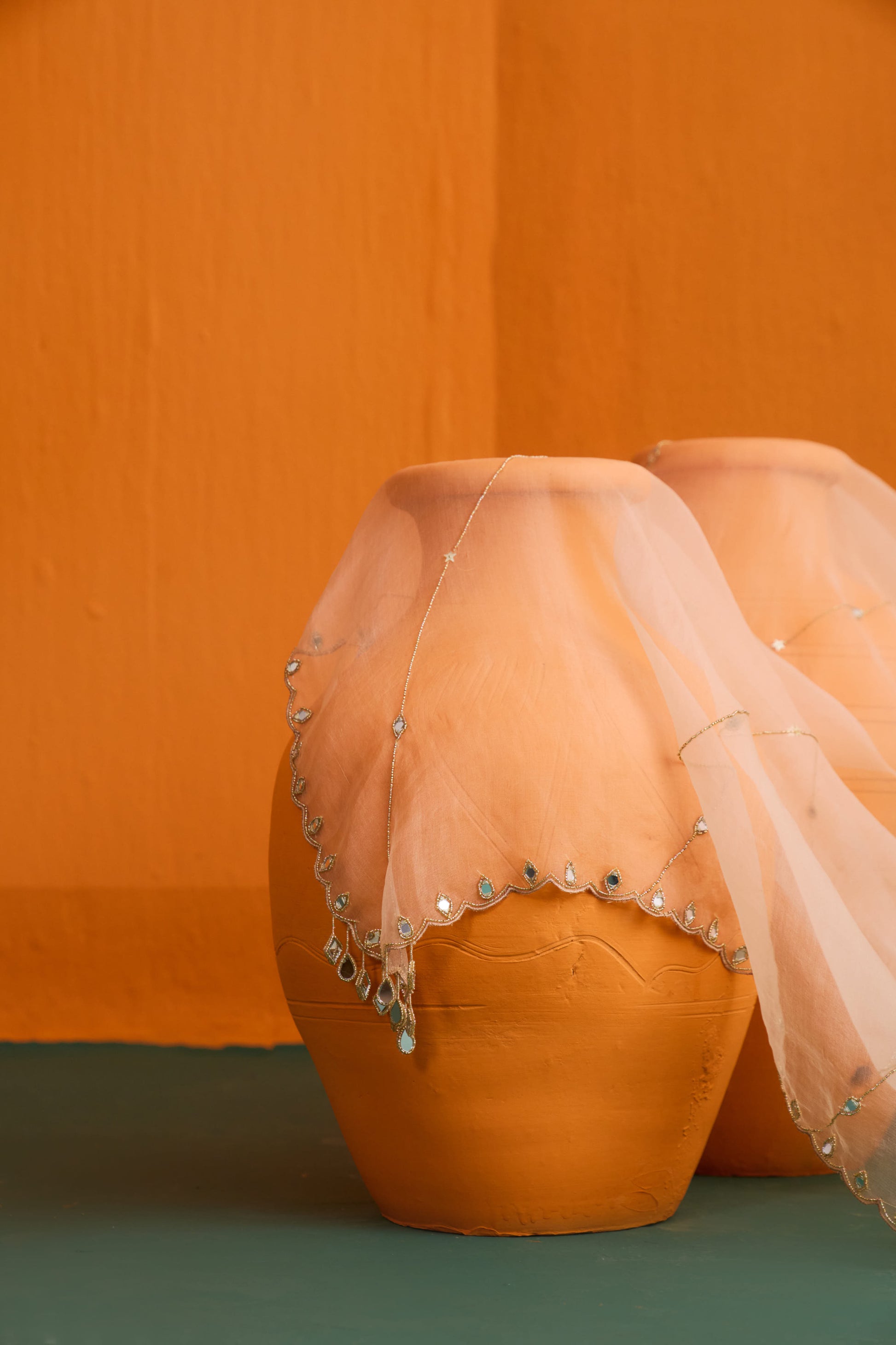 A sheer organza dupatta completes the ensemble, edged with scalloped borders and enhanced with mirror and bead embroidery, lending a graceful, contemporary touch.